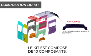 L’installation s’effectue grâce au système EasyFix, sans perçage des parties structurelles du véhicule, au moyen de fixations dédiées. Cela permet de réduire les temps d’installation et de préserver l’intégrité structurelle du véhicule. Les découpes des vitrages, y compris celles des portes arrière et latérales, sont réalisées en affleurement et finies au ras du verre, garantissant un résultat intérieur soigné et professionnel tout en simplifiant les opérations d’installation.