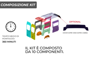 Il kit è realizzato in ABS grigio goffrato ed è disponibile, su richiesta, anche in ABS bianco goffrato. Le superfici sono impermeabili, resistenti e facilmente lavabili, caratteristiche fondamentali per veicoli destinati al trasporto passeggeri professionale.